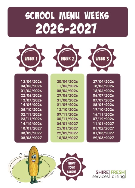 Shire Services provide school meals on behalf of the school. A menu and an information leaflet can be seen below.